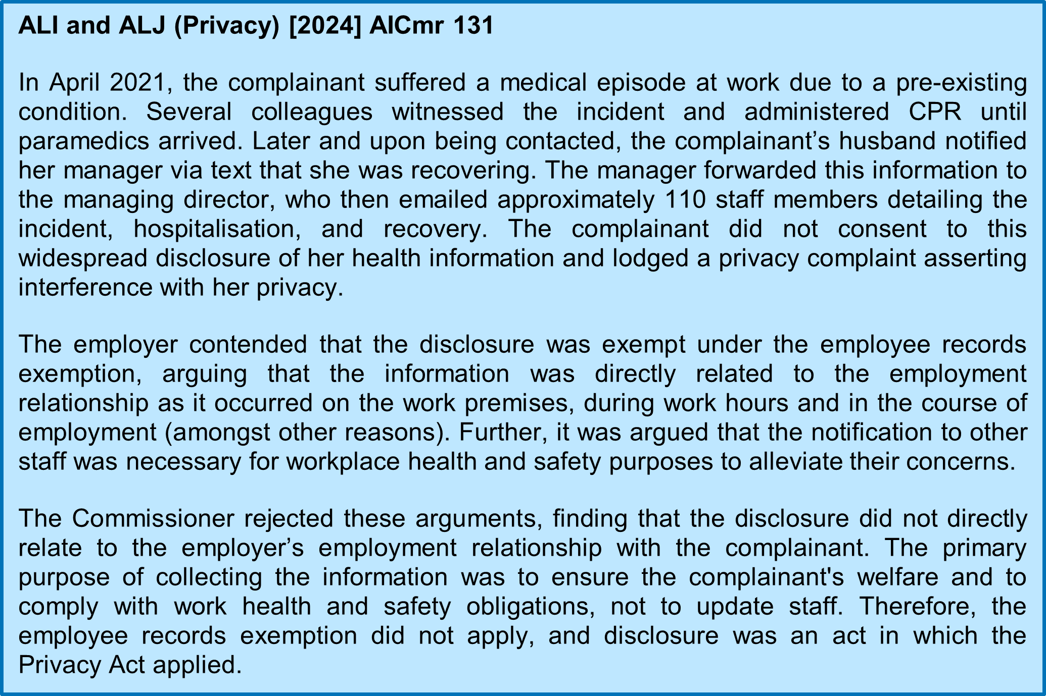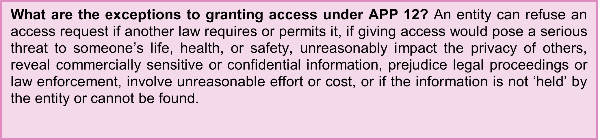 By way of illustrative example, if an individual wants to see their own performance review notes or payroll records, these are likely considered employee records handled as part of employment. Because of that, the employee record exemption usually applies, which means they may not be able to access the information under the Privacy Act and APP 12.