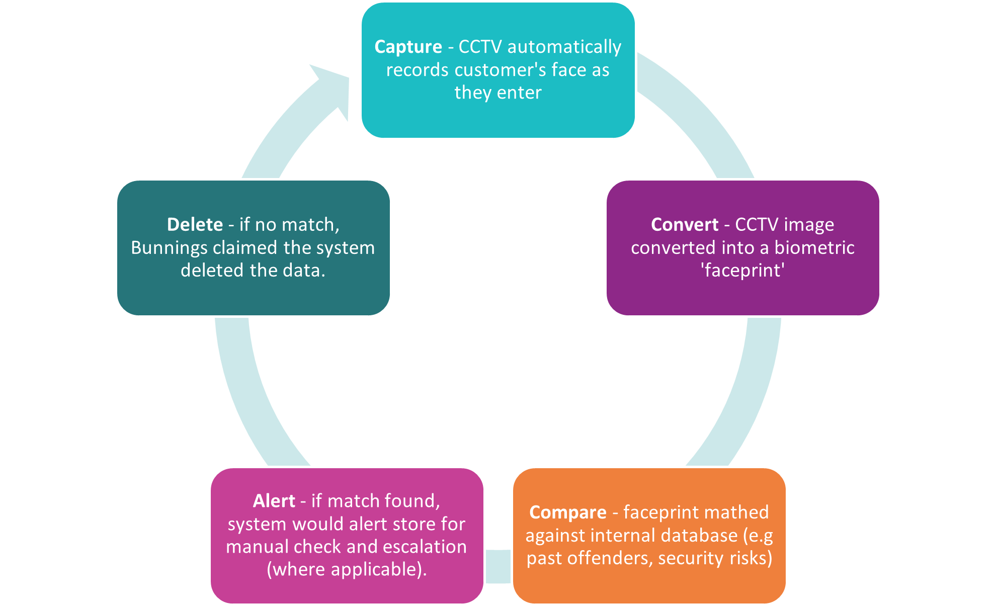 The FRT system operated by Bunnings’ followed a continuous cycle, automatically scanning and processing every customer who entered their FRT enabled stores as follows.