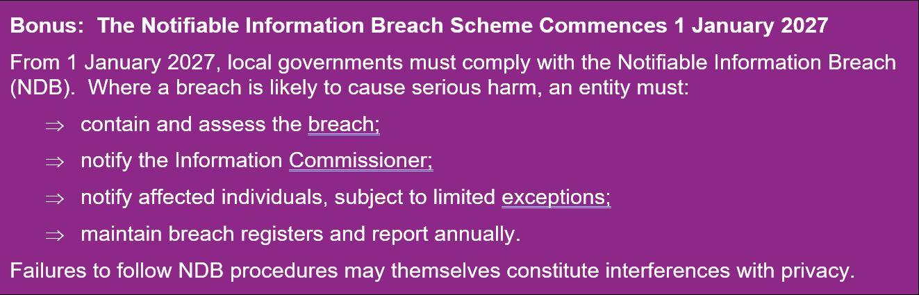 From 1 July 2026, local governments will be required to comply with the 11 Information Privacy Principles (IPPs) in Schedule 1 of the PRIS Act. This will require councils to demonstrate compliance across the entire information lifecycle, including (among other things):