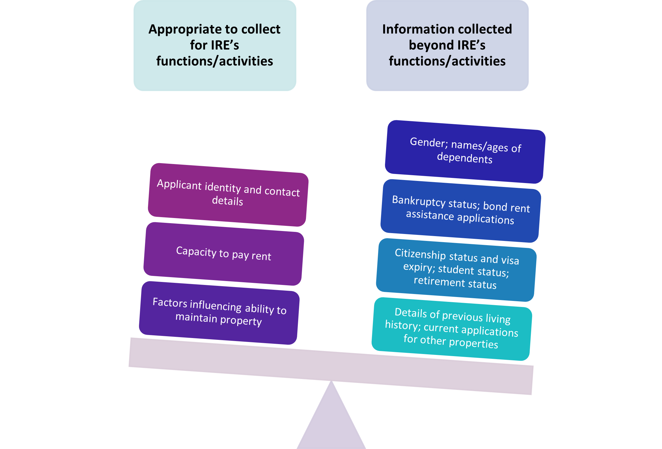 Below illustrates the contrast between the information the Commissioner considered reasonably necessary for IRE’s functions/activities, and the breadth of information collected through the 2Apply default list: